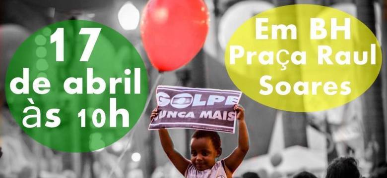 A Frente Brasil Popular Minas vai realizar, no domingo (17), Ato Público contra o Golpe, na Praça da Estação, Região Central de Belo Horizonte. A concentração, seguida de Vigília pela Democracia, começará às 13 horas e seguirá até o fim da votação no processo de impeachment no Câmara dos Deputados. Estão programadas apresentações culturais, rodas de conversa e será instalado um telão para acompanhar a sessão no Congresso.