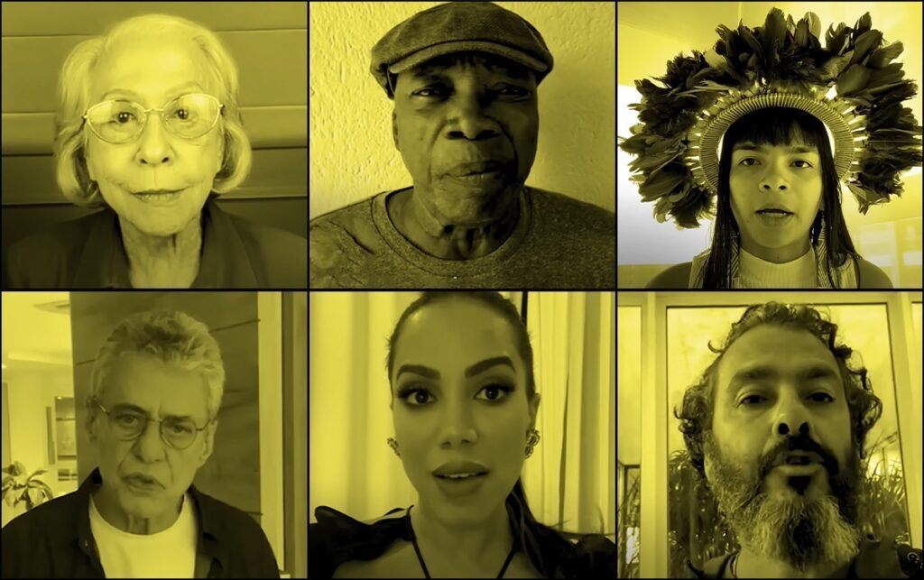 Participam do vídeo: Alice Wegmann, Alinne Moraes, Anitta, Antônio Fagundes, Antonio Pitanga, BK, Bruno Mazzeo, Caetano Veloso, Camila Pitanga, Chico Buarque, Christiane Torloni, Cláudia Abreu, Dan Ferreira, Daniela Mercury, Dira Paes, Djavan, Duda Beat, Enrique Díaz, Ernesto Piccolo, Fábio Assunção, Fernanda Montenegro, Gal Costa, Ícaro Silva, José de Abreu, Juliette, Lázaro Ramos, Linn da Quebrada, Luisa Sonza, Manui Gavassi, Marcos Palmeira, Maria Bethânia, Maria Gadu, Maria Ribeiro, Mario Mante, Milton Nascimento, Nando Reis, Paula Lima, Paulo Betti, Rogério Flausino, Seu Jorge, Txai Suraí e Wagner Moura.
