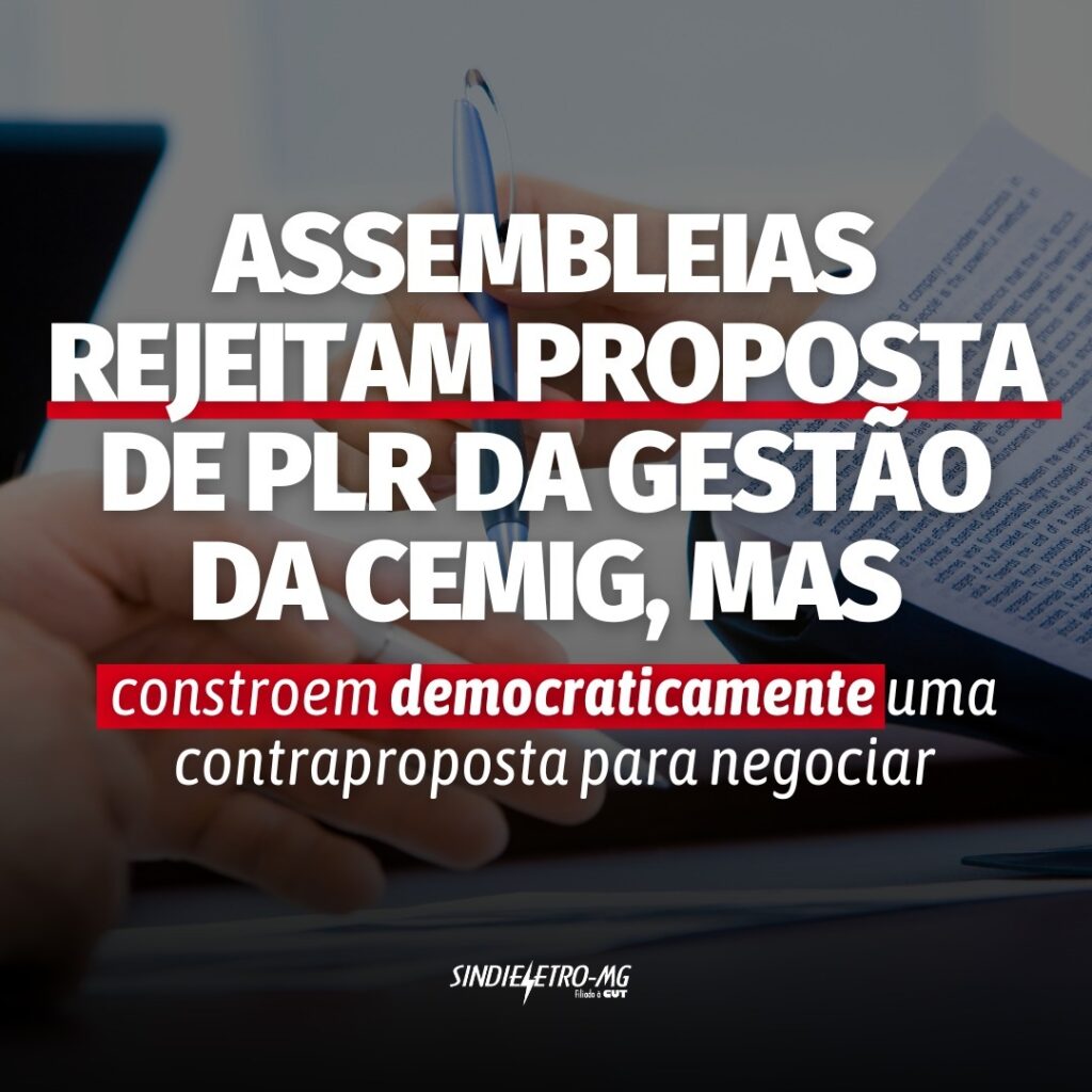As assembleias realizadas em todo o estado no período de 27 de fevereiro a 04 de março rejeitaram a proposta da gestão da Cemig de PLR 2024, aprovando, ao mesmo tempo, uma contraproposta de Participação nos Lucros e Resultados para ser negociada com o Sindieletro. A rejeição da proposta da Cemig foi de 94% e a aprovação da contraproposta de PLR, construída pelos trabalhadores e trabalhadoras, foi de 96,7% dos participantes das assembleias.