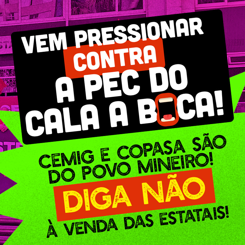 Água e energia são direitos do povo mineiro, não mercadorias! A chamada PEC 24/2023, conhecida como “PEC da Cala a Boca”, tenta calar a população ao retirar o direito ao referendo popular sobre a venda da Cemig e da Copasa. Se passar, o governador Zema terá carta branca para entregar nosso patrimônio a empresários, resultando em tarifas mais caras, piora nos serviços e exclusão dos mais pobres do acesso à água e à energia.