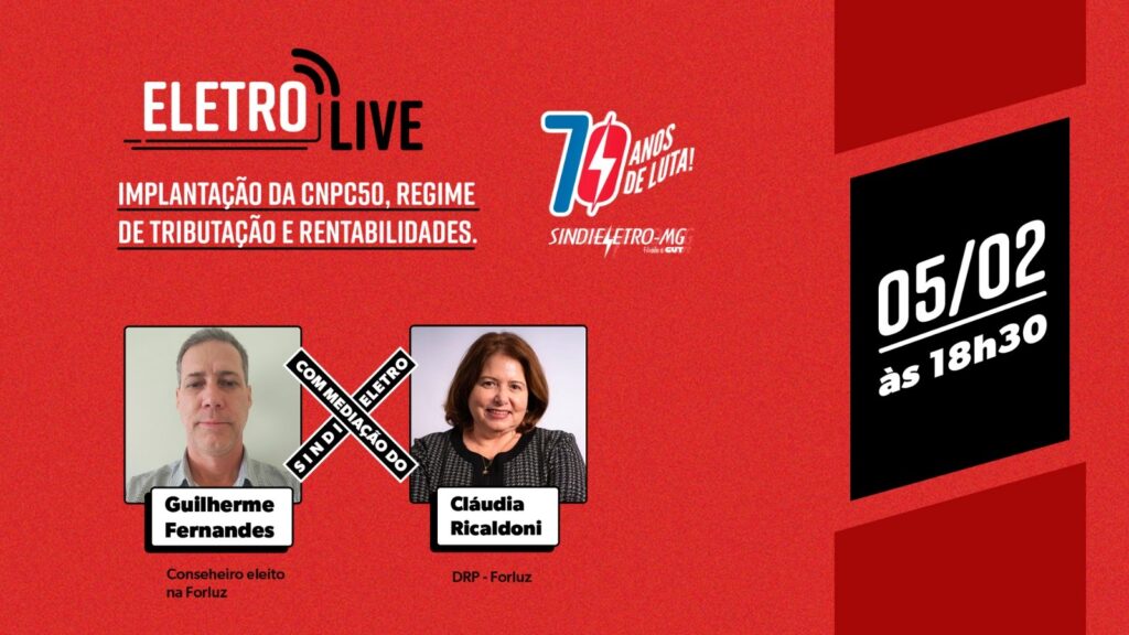 Teremos na mesa do debate virtual a Diretora de Relações com os Participantes (DRP), Cláudia Ricaldoni, e o Conselheiro Eleito na Forluz, Guilherme Fernandes, com mediação do Sindieletro.