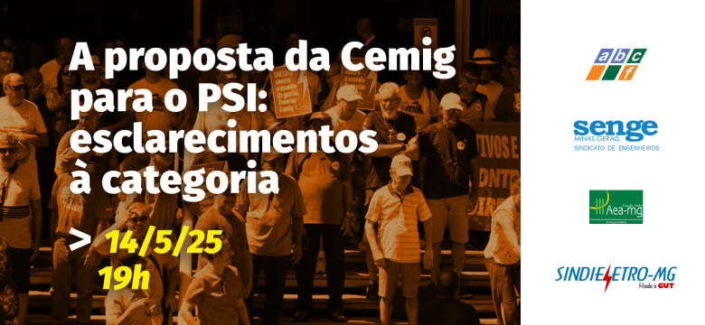 Na quarta-feira, 14/05, o Sindieletro, a ABCF, o Senge-MG e a AEA-MG realizam a live “A proposta da Cemig para o PSI: esclarecimentos à categoria”, para apresentar e debater os termos da nova proposta da empresa, divulgada na sexta-feira, 9/05. A transmissão será ao vivo pelo canal do Sindieletro no YouTube, a partir das 19h.
