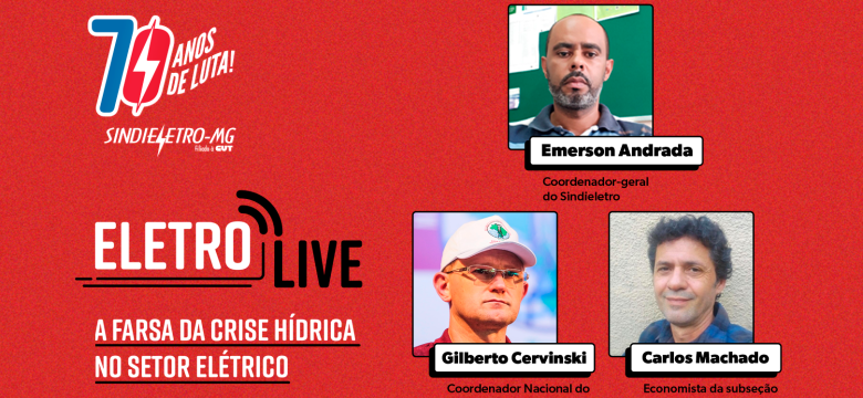 Estamos vendo uma crescente discussão sobre a crise hídrica iminente no país. No entanto, os discursos sobre o clima e a necessidade de aumento na conta de luz ignoram (ou mascaram) a realidade. Presenciamos uma FARSA, e para explicar isso melhor, nossa #EletroLive16 vai tratar sobre o assunto. No papo, nosso coordenador-geral, Emerson Andrada, recebe Gilberto Cervinski, da Coordenação Nacional do MAB e membro da Plataforma Operária e Camponesa de Água e Energia e Carlos Machado, economista da subseção do Dieese no Sindieletro-MG.