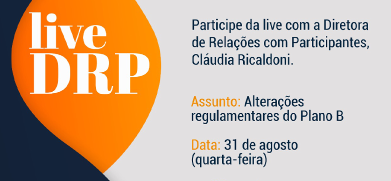A Diretora de Relações com o Participante, Cláudia Ricaldoni, realiza na próxima quarta-feira, (31/08), uma live para falar sobre as alterações do Plano B, aprovadas pela Previc neste mês de agosto. O evento acontecerá através da plataforma Zoom, às 17 horas. Não é necessário fazer inscrição prévia nem utilizar senha para acessar a live.