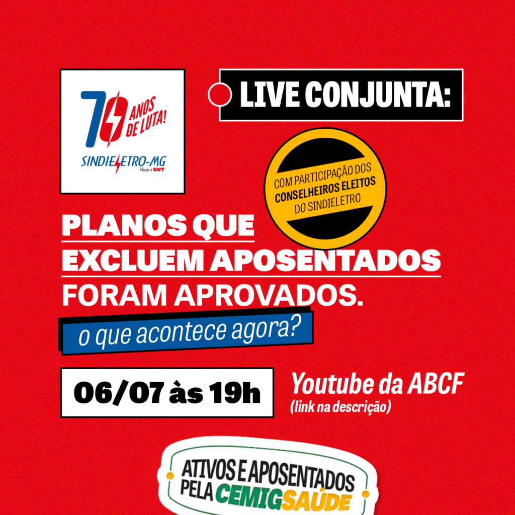 Live conjunta logo mais, às 19h: ABCF e Sindieletro vem conversar sobre o que houve na reunião da Cemig Saúde no dia 30 de junho! É hoje, quarta-feira, 6/07, às 19 horas, no YouTube da ABCF.