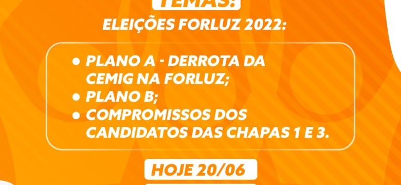 A terceira live das chapas 1 e 3: Unidade e Compromisso na Forluz vai trazer temas de interesse dos beneficiários. Falaremos sobre a derrota da Cemig na Forluz, o Plano B e os compromissos dos candidatos das Chapas 1 e 3. É hoje, segunda-feira (20), às 19h.