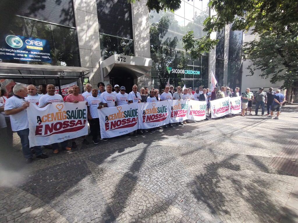 Beneficiários e beneficiárias realizam mais um grande ato pela Cemig Saúde em frente à Sede da empresa. Durante este ato, a quarta reunião foi realizada, mas sem avanços. Durante mediação no Tribunal Regional do Trabalho (TRT) naquela manhã, não houve acordo e o dissídio segue seu curso.