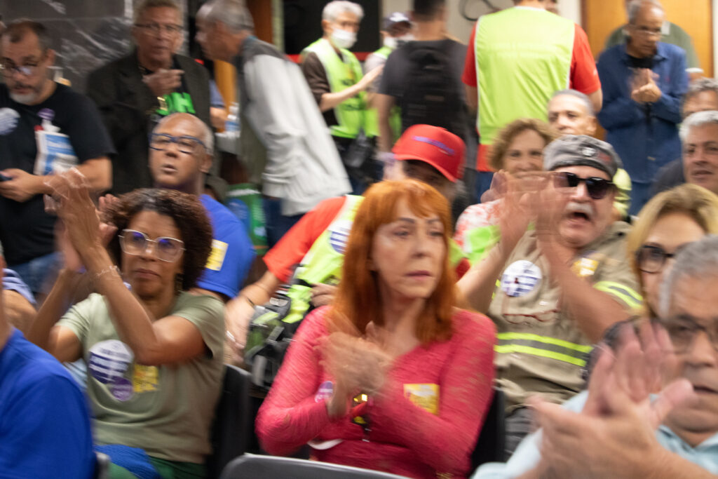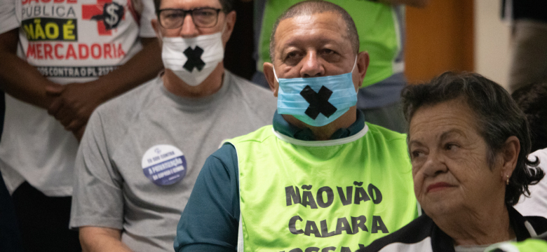 Na última segunda-feira (30), lotamos a sala em frente ao Plenarinho IV, onde acontecia mais uma reunião da Comissão de Constituição e Justiça (CCJ) da Assembleia Legislativa (ALMG). Com coletes e máscaras simulando uma mordaça, deixamos claro que não vamos deixar que o governo de Romeu Zema silencie os servidores e a população mineira. Não vão calar a nossa voz! Mais uma vez, pela pressão dos parlamentares da bancada dos trabalhadores, foi adiada a votação da Proposta de Emenda à Constituição (PEC) 24/2023, a PEC do Cala a Boca. Junto aos trabalhadores do saneamento, demos o recado: não vão calar a nossa voz! É a terceira vez em que deputados da oposição ao governo conseguem obstruir a votação do projeto que pretende extinguir a obrigatoriedade do referendo popular para a privatização das estatais mineiras. Vale lembrar que a PEC do Cala a Boca é essencial ao governo Zema para entregar as estatais através do Propag. Nossa luta não acabou! Continuaremos mobilizados.