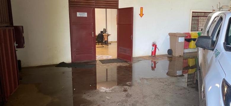 Foto principal: Poça de água da chuva devido a buracos no telhado do galpão do CRIU.
