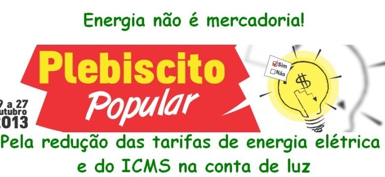 Começou no dia 19 de outubro, em todo o estado de Minas Gerais, o Plebiscito Popular, consulta que vai perguntar à população mineira o que ela acha do preço da conta de luz. As mais de 100 organizações que constroem o plebiscito esperam recolher 1 milhão de votos e entregá-los ao governo do estado, com a intenção de diminuir o preço da energia. O plebiscito vai até o dia 03 de novembro.