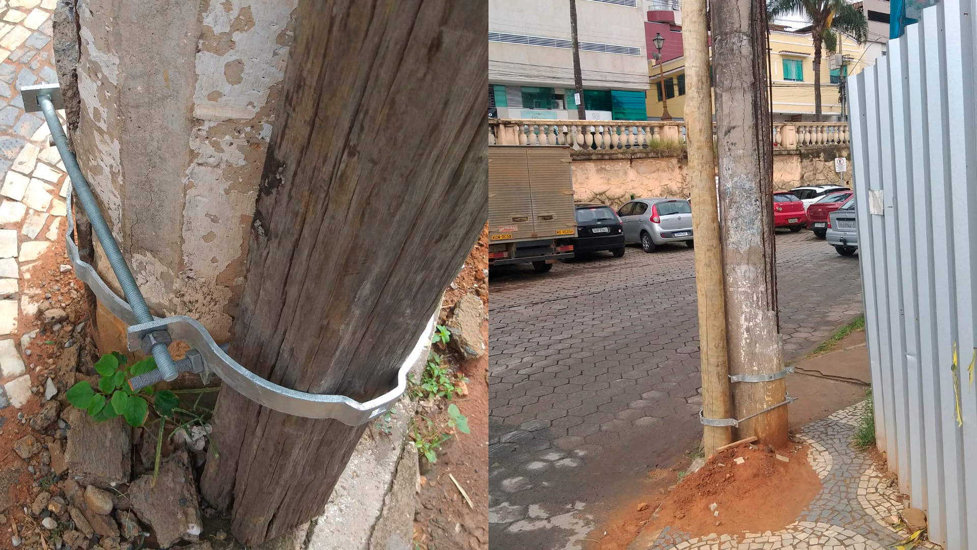 No centro da cidade de Viçosa, uma das cidades mais importantes da região de Ponte Nova, há um poste escorado há, no mínimo, 30 dias. A calçada foi estreitada devido a uma construção antiga, e o espaço para o pedestre está reduzido e apertado. O risco de acidente é enorme: veja, nas imagens, o detalhe da colocação do parafuso que fixa a cinta. Há risco de acidente para os transeuntes, em especial crianças e idosos. A situação é crítica e perigosa!