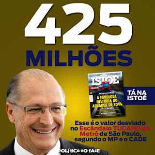 Apesar do silêncio cúmplice do grosso da mídia, a revista IstoÉ que chegou às bancas nesta sexta-feira não recuou nas denúncias sobre o propinoduto tucano em São Paulo. Em nova reportagem de capa, intitulada “A fabulosa história do achaque de 30%”, a publicação revela que pelos menos R$ 425 milhões foram saqueados dos cofres públicos num esquema mafioso montado entre o alto tucanato e várias multinacionais do setor de transporte.