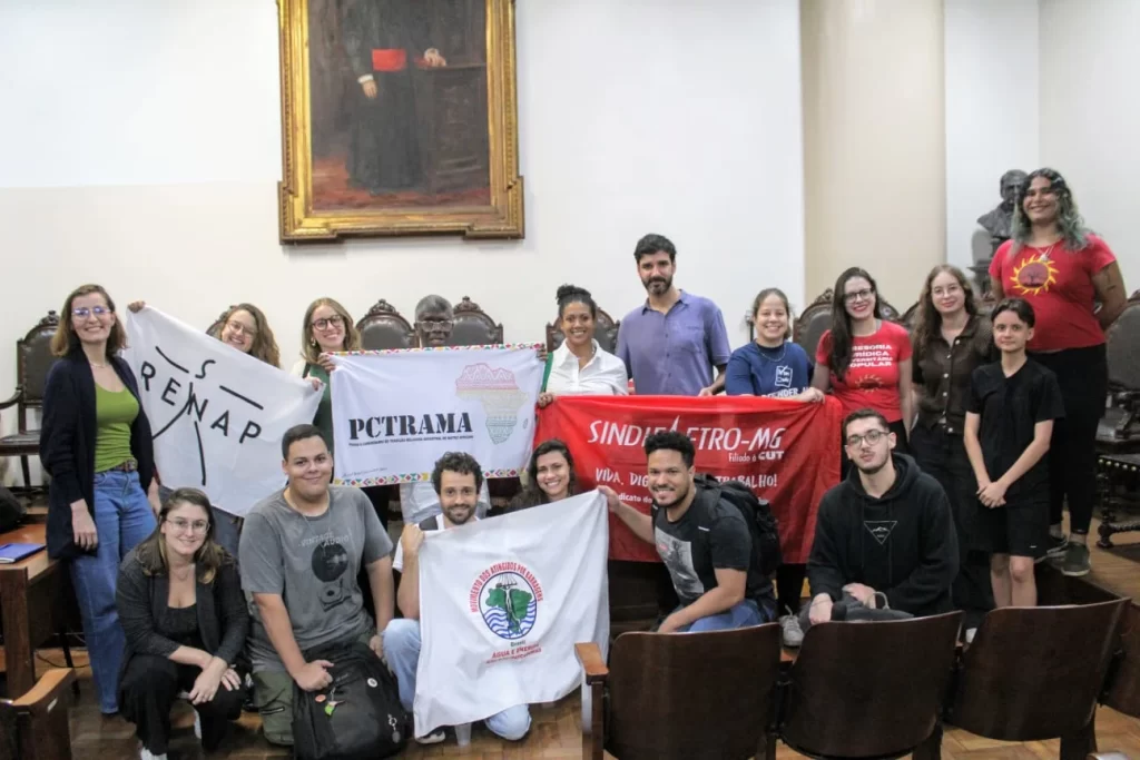 A entidade foi representada por Caroline Ruella, diretora de formação do sindicato, que destacou os riscos das propostas de privatização da Copasa e da Cemig, além de relacionar esse processo à lógica extrativista que também está na base de tragédias como os crimes de Mariana e Brumadinho.