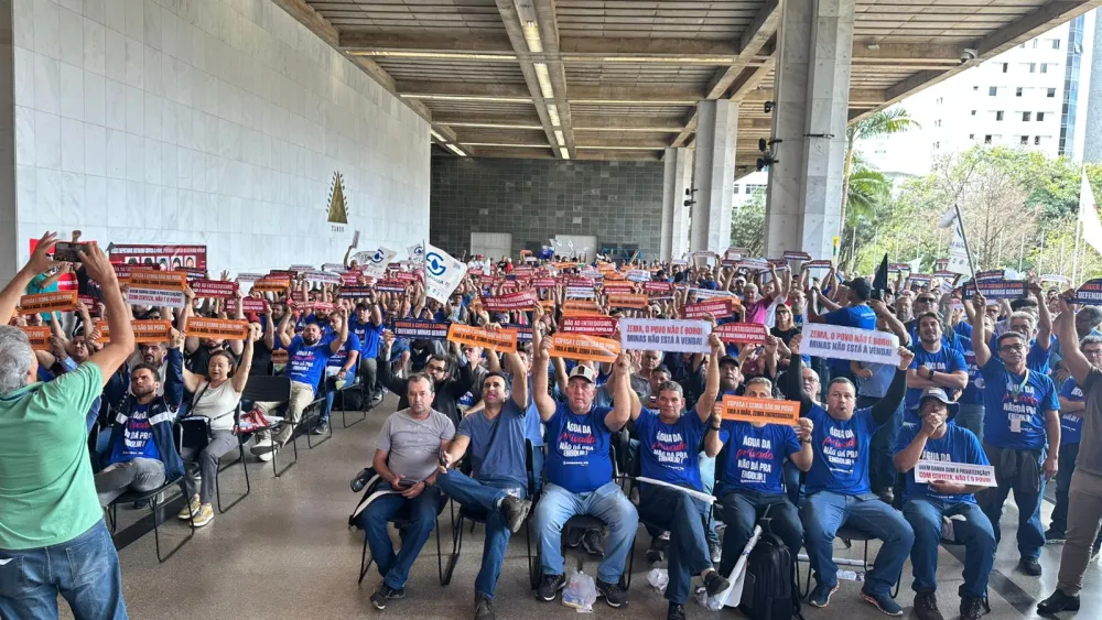 Com gritos de ‘Fora Zema’, os trabalhadores protestam contra a possibilidade de privatização da Copasa. Para abrir os trabalhos, o deputado Betão (PT) classificou a necessidade do referendo como uma vitória do parlamento no início deste século, quando a Assembleia aprovou por unanimidade e medida proposta pelo então governador Itamar Franco.
