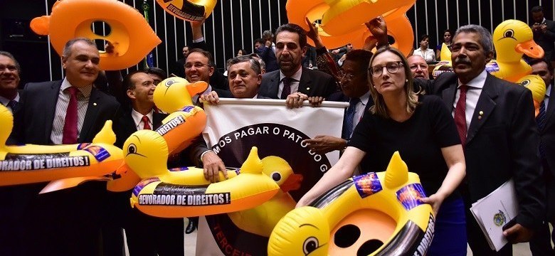 Parlamentares da oposição fizeram um protesto com patos infláveis, referência ao símbolo de manifestações contra a corrupção capitaneadas pela Federação das Indústrias do Estado de São Paulo (Fiesp). “Pato corrupto, pato golpista”, disse Chico Alencar (Psol-RJ). Era também uma menção ao fato de o trabalhador, com o projeto, estar “pagando o pato”, com uma lei que possivelmente irá prejudicá-los.